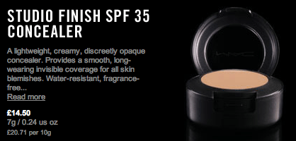 - MAC Studio Finish SPF 35 Concealer – Creamy, light & long-lasting. Great all-round concealer @ £14.50.