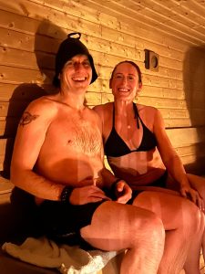 This doesn’t mean cold water therapy has no place – a brief sea dip alongside a sauna – I can confirm is exhilarating! But it does suggest that women do not need to endure really cold temperatures to build resilience, which happens for us more effectively through heat exposure. Phew! (pictured here after a dip with Paul at The Saltwater Sauna, at Sandbanks last October.)