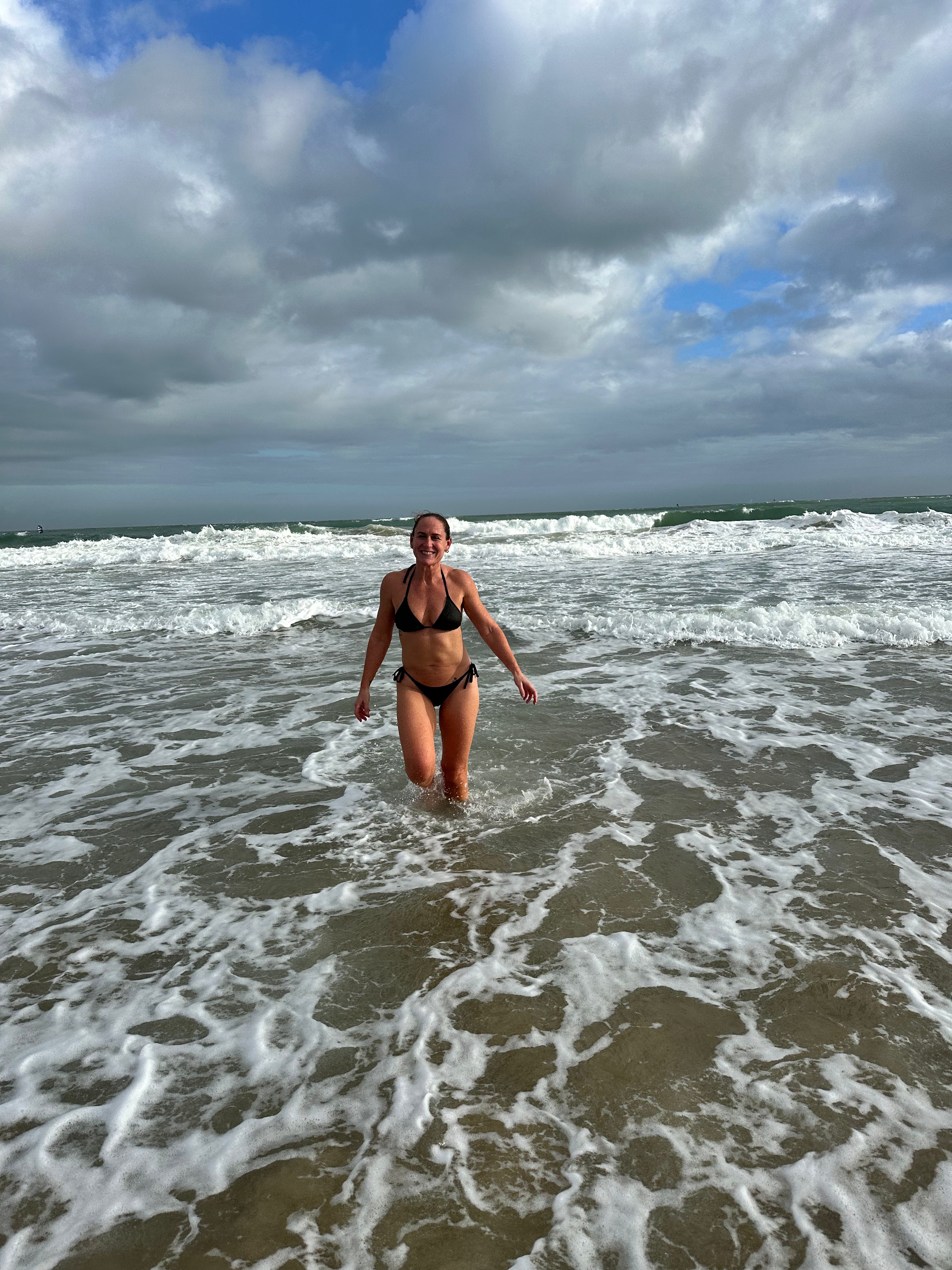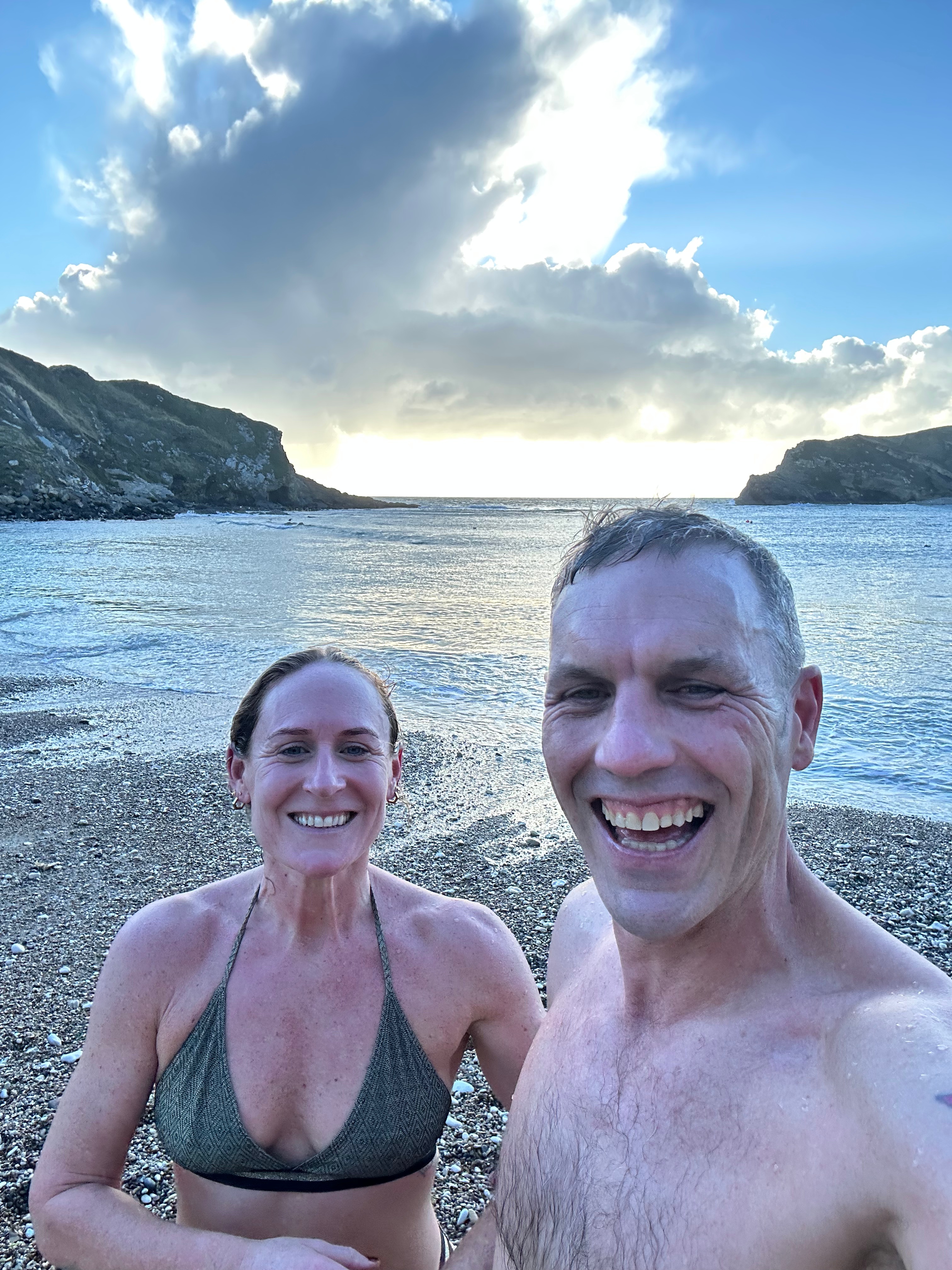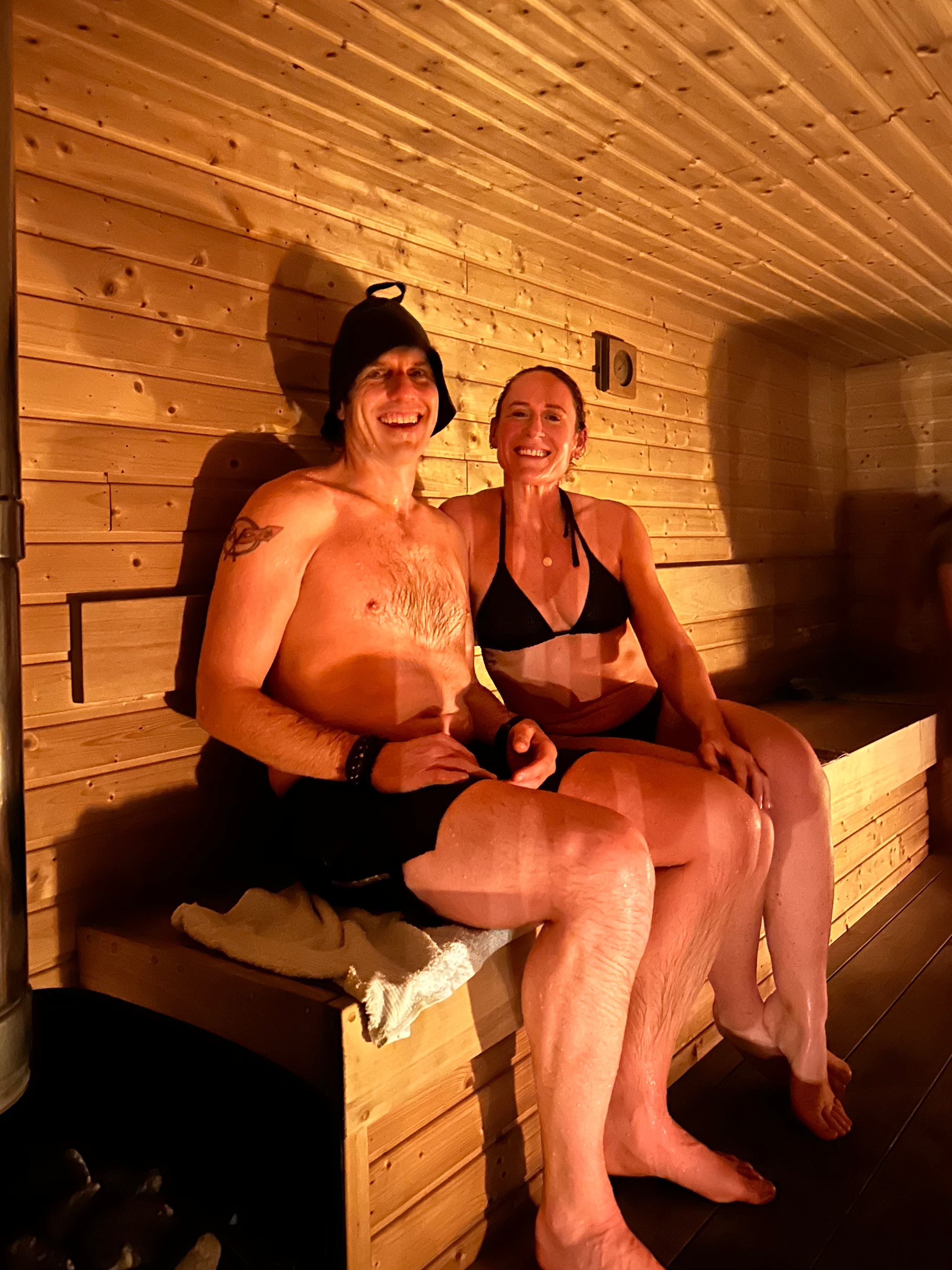 This doesn’t mean cold water therapy has no place – a brief sea dip alongside a sauna – I can confirm is exhilarating! But it does suggest that women do not need to endure really cold temperatures to build resilience, which happens for us more effectively through heat exposure. Phew! (pictured here after a dip with Paul at The Saltwater Sauna, at Sandbanks last October.)